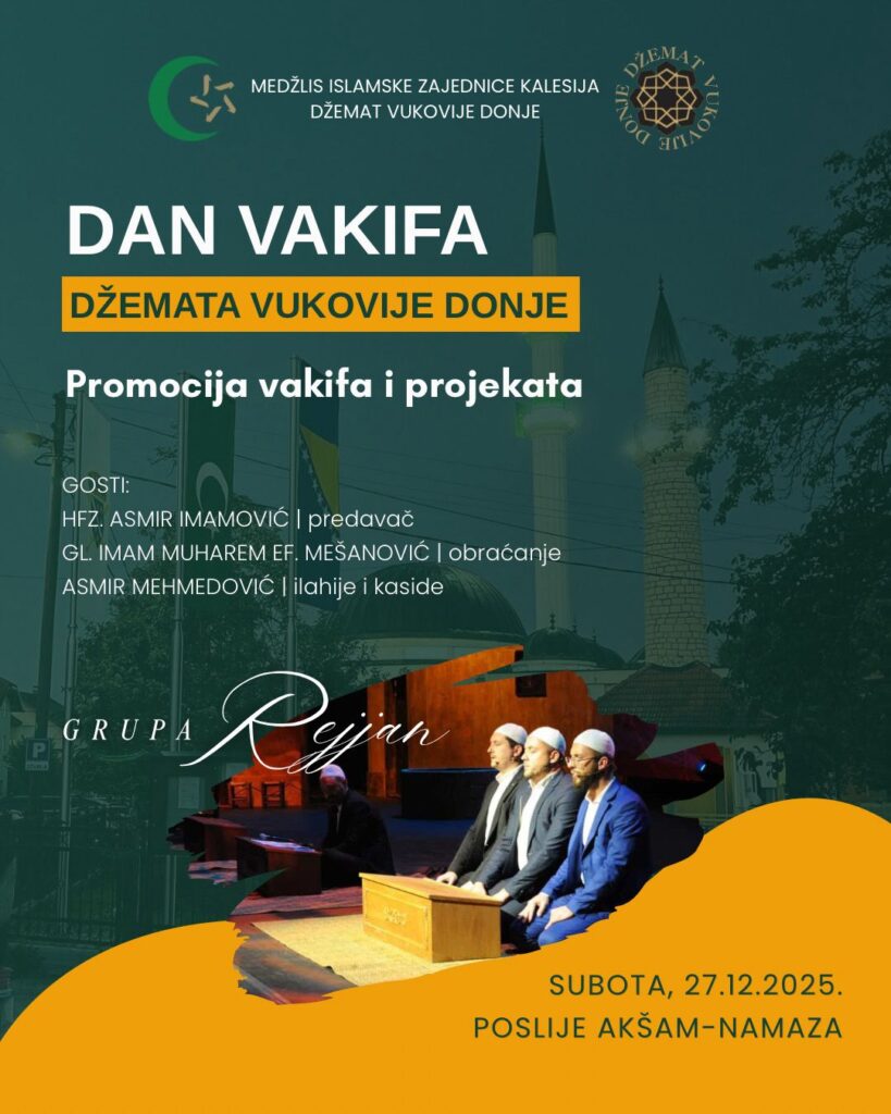 Džemat Vukovije Donje s posebnim zadovoljstvom obavještava džematlije i širu javnost da će u subotu, 27. decembra 2025. godine, nakon akšam-namaza, biti upriličena svečanost povodom Dana vakifa džemata Vukovije Donje.
