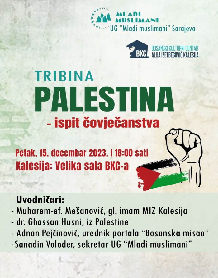 U znak podrške plestinskom narodu, u Kalesiji, u organizaciji UG „Mladi muslimani“ Sarajevo, u petak, 15. decembra, sa početkom u 18,00 sati, održat će se tribina o temi „Palestina – ispit čovječanstva“.