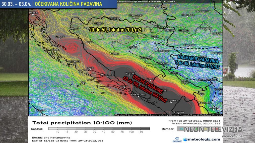 Danas popodne stižu padavine. Zahvatiće najprije Hercegovinu, jugozapad i zapad Bosne donoseći kišu i pljuskove. Navečer i u noći na četvrtak širit će se postepeno i na ostatak zemlje. U četvrtak i petak izuzetno obilne padavine u Hercegovini i na jugozapadu Bosne, zbog čega je izdato i crveno upozorenje od strane FHMZBiH. Količina padavina ta dva dana 50 do 100, lokalno do 140 l/m2. Postoji opasnost od lokalno mogućih bujičnih poplava usljed obilne kiše za relativno kratko vrijeme! Kiše i pljuskova će biti i u ostatku zemlje u četvrtak i petak, većinom povremeno i u nešto manjim količinama u odnosu na Hercegovinu i jugozapad Bosne. Uz kiša i pljuskove lokalno će biti grmljavine, uglavnom nad Hercegovinom, jugozapadom i zapadom Bosne.
