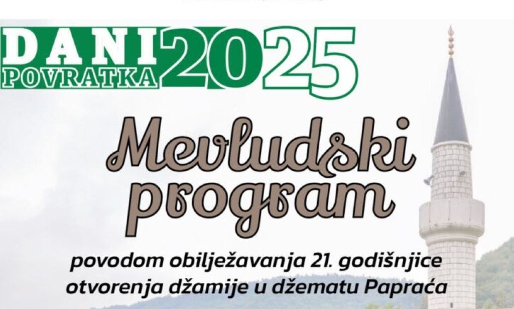 U subotu, 26. jula 2025. god., prije podne-namaza sa početkom u 11:30 sati, biće izveden mevludski program povodom obilježavanja 21. godišnjice otvaranja džamije u Papraći.