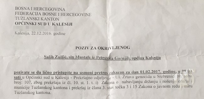 Ali je zato na adresu Zulfića iz Općinskog suda Kalesija stigao poziv na saslušanje, za držanje oružja i municije te za remećenje javnog reda i mira.