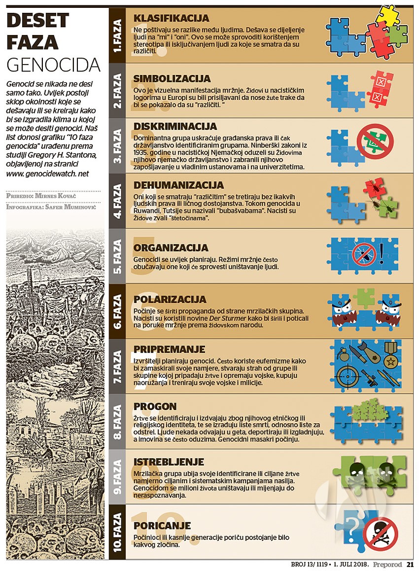 Genocid se nikada ne desi samo tako. Uvijek postoji sklop okolnosti koje se dešavaju ili se kreiraju kako bi se izgradila klima u kojoj se može desiti genocid. Naš list donosi grafiku “10 faza genocida” urađenu prema studiji Gregory H. Stantona, objavljenoj na stranici www. genocidewatch. net