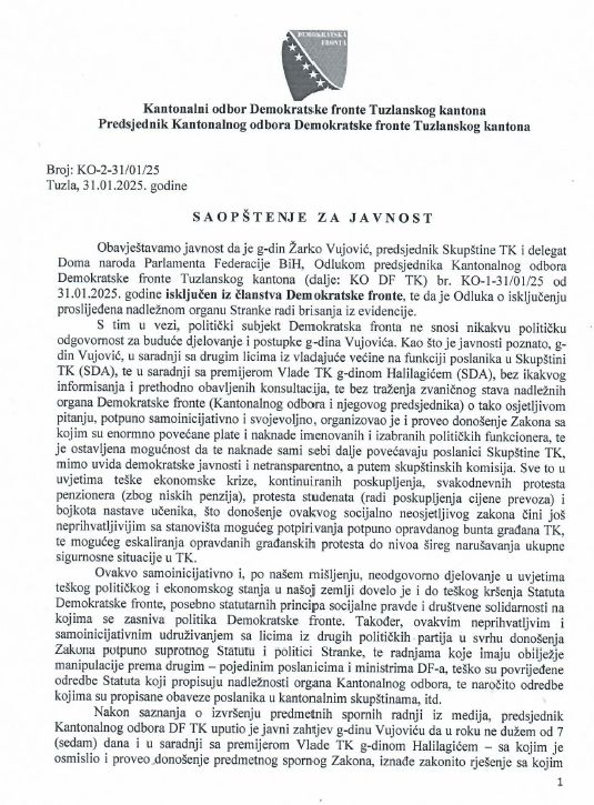 Žarko Vujović, predsjednik Skupštine Tuzlanskog kantona i delegat u Doma naroda Parlamenta FBiH isključen je iz članstva Demokratske fronte, objavljeno je iz Kantonalnog odbora Demokratske fronte Tuzlanskog kantona. Odluka o isključenju proslijeđena je nadležnom organu stranke radi brisanja iz evidencije.