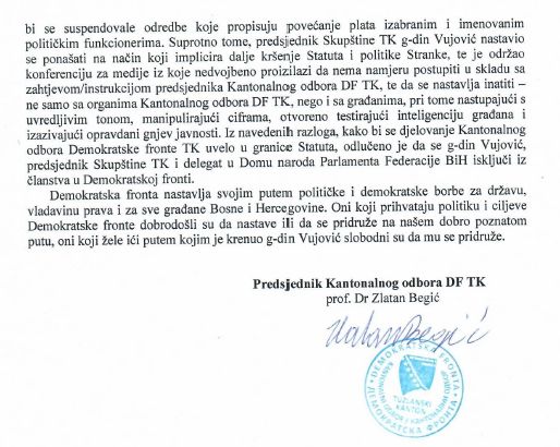 – S tim u vezi, politički subjekt Demokratska fronta ne snosi nikakvu političku odgovornost za buduće djelovanje i postupke g-dina Vujovića. Kao što je javnosti poznato, g-din Vujović, u saradnji sa drugim licima iz vladajuće većine na funkciji poslanika u Skupštini TK (SDA), te u saradnji sa premijerom Vlade TK g-dinom Halilagićem (SDA), bez ikakvog informisanja i prethodno obavljenih konsultacija, te bez traženja zvaničnog stava nadležnih organa Demokratske fronte (Kantonalnog odbora i njegovog predsjednika) o tako osjetljivom pitanju, potpuno samoinicijativno i svojevoljno, organizovao je i proveo donošenje Zakona sa kojim su enormno povećane plate i naknade imenovanih i izabranih političkih funkcionera, te je ostavljena mogućnost da te naknade sami sebi dalje povećavaju poslanici Skupštine TK, mimo uvida demokratske javnosti i netransparentno, a putem skupštinskih komisija. Sve to u uvjetima teške ekonomske krize, kontinuiranih poskupljenja, svakodnevnih protesta penzionera (zbog niskih penzija), protesta studenata (radi poskupljenja cijene prevoza) i bojkota nastave učenika, što donošenje ovakvog socijalno neosjetljivog zakona čini još neprihvatljivijim sa stanovišta mogućeg potpirivanja potpuno opravdanog bunta građana TK, te mogućeg eskaliranja opravdanih građanskih protesta do nivoa šireg narušavanja ukupne sigurnosne situacije u TK – navode iz KO DF TK u saopćenju.