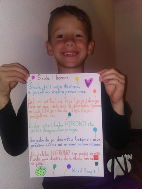 “Od kolijevke pa do groba najljepše je đačko doba” rečenica je koja se prenosi sa generacije na generaciju. Da je đačko doba najlješe ovih dana potvrđuju nam mnogi učenici koji su školske klupe morali napustiti zbog pandemije koronavirusa. Učenici u školskim klupama nisu od 12.marta,iako je uspostavljena online nastava njima fali druženje u razredu. Drugari i učiteljica fale i Vedadu Smajiću koji je uz pomoć mame napisao i pjesmu. Vedad želi da korona nestane, želi ići na trening, družiti se sa drugarima. Vedadovu pjesmicu možete pročitati na fotografiji ispod.