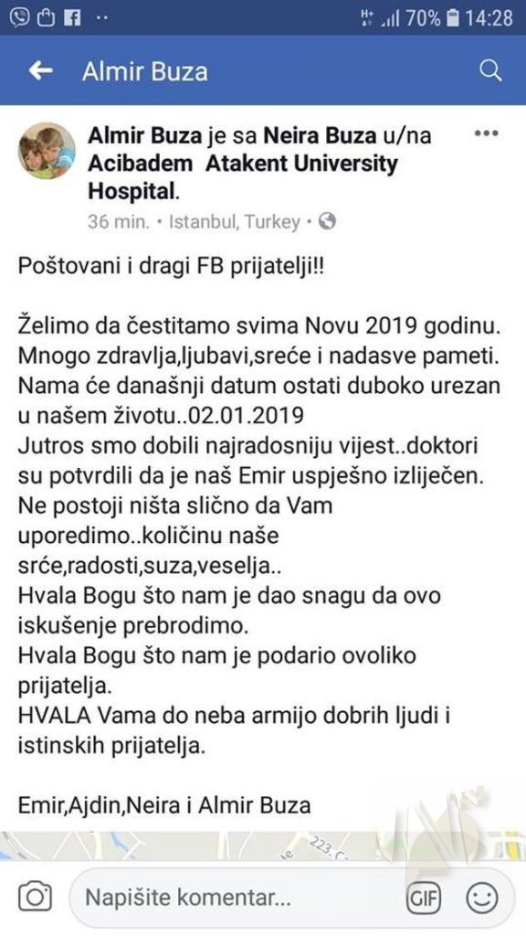 “Želimo da čestitamo svima Novu 2019 godinu. Mnogo zdravlja,ljubavi,sreće i nadasve pameti. Nama će današnji datum ostati duboko urezan u našem životu..02.01.2019. Jutros smo dobili najradosniju vijest. Doktori su potvrdili da je naš Emir uspješno izliječen! Ne postoji ništa slično da Vam uporedimo, količinu naše sreće, radosti, suza, veselja…Hvala Bogu što nam je dao snagu da ovo iskušenje prebrodimo. Hvala Bogu što nam je podario ovoliko prijatelja. Hvala Vama do neba armijo dobrih ljudi i istinskih prijatelja”, napisano je na Facebook profilu Almira Buze, a u potpisu su stajali Emir, Ajdin, Neira i Almir Buza.