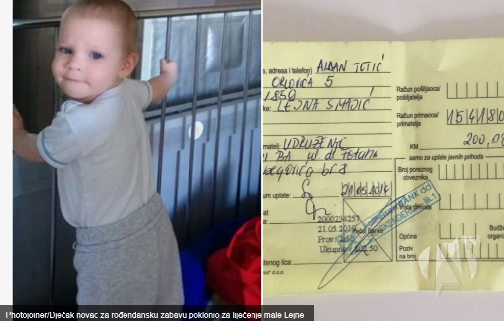 Naime, desetogodišnji Aidan Totić iz Sarajeva, čuvši za humanitarnu akciju koja je u toku, imao je za svoje roditelje veliku molbu. Naime, on je odlučio da 200 KM, novac koji je štedio za njegovu rođendansku zabavu, uplati na ime pomoći djevojčici kojoj je naša podrška u ovom trenutku prijeko potrebna.