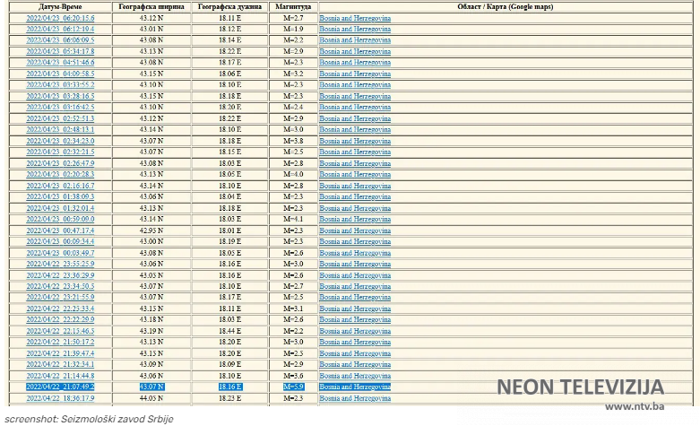 Prema listi zabilježenih zemljotresa sinoć i noćas u okolini Stoca može se vidjeti da je snažnom zemljotresu prethodio jedan slabiji koji se dogodio u 20:36 sati čija je jačina bila 2,3 stepeni po Rihteru.