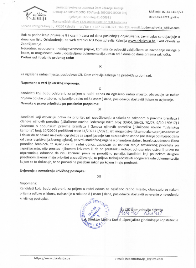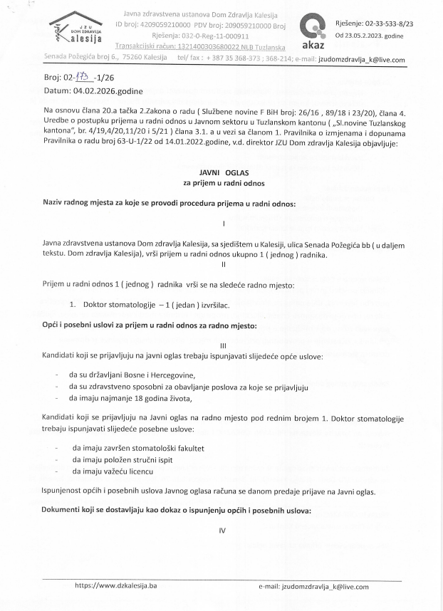 Javna zdravstvena ustanova Dom zdravlja Kalesija raspisuje javni oglas za prijem radnika u radni odnos na poziciju – Doktor stomatologije (1 izvršilac/neodređeno).