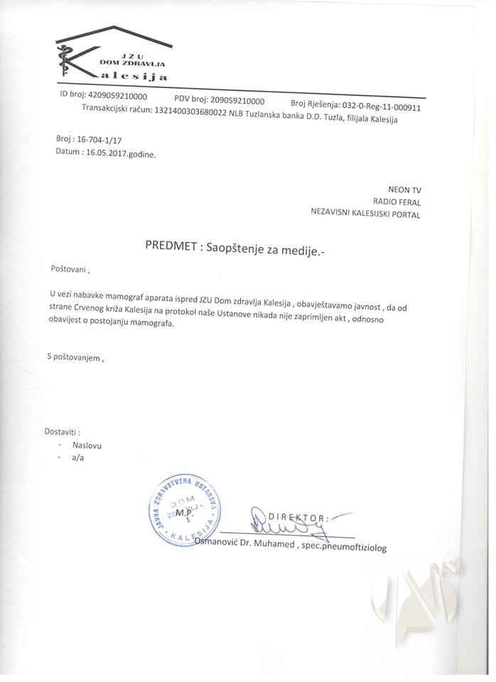 JZU Dom zdravlja Kalesija oglasila se povodom akcije za nabavku mamografa, a sa obrazloženjem da ova Ustanova nikada nije dobila obavijest o postojanju mamografa.