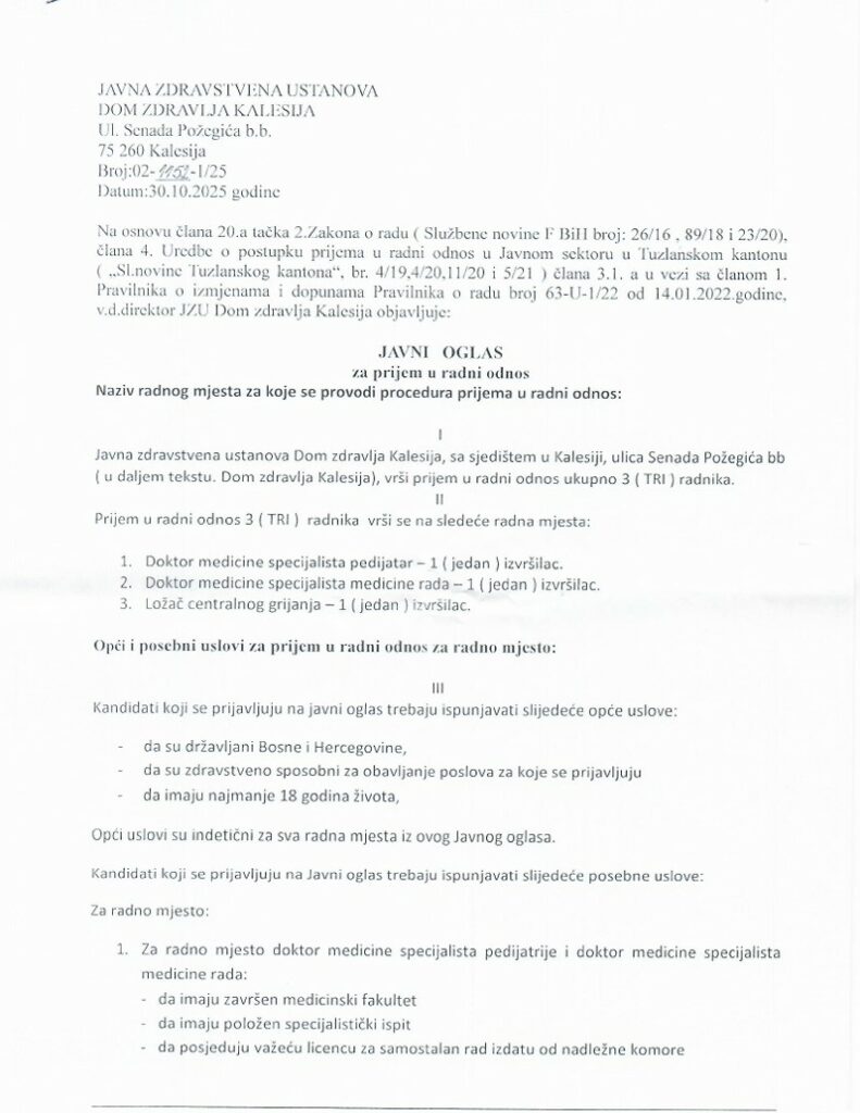 Javna zdravstvena ustanova Dom zdravlja Kalesija je 30. oktobra 2025. godine raspisala je javni oglas za prijem radnika u radni odnos. Prijem radnika vrši se na sljedeće pozicije: