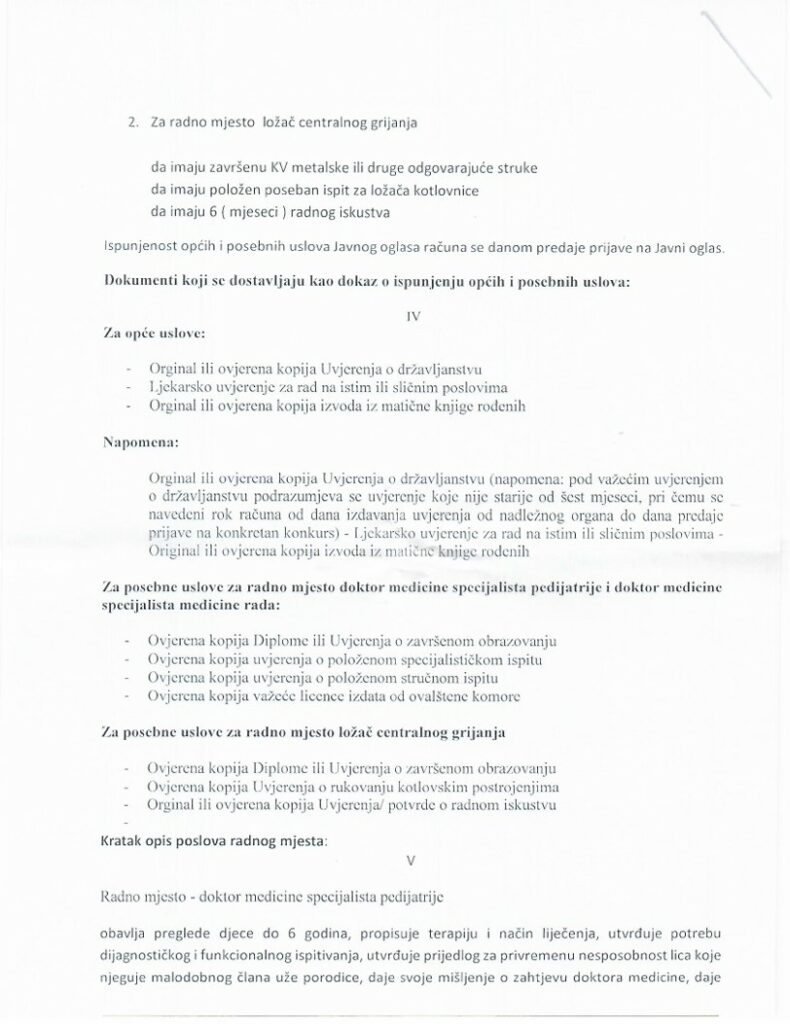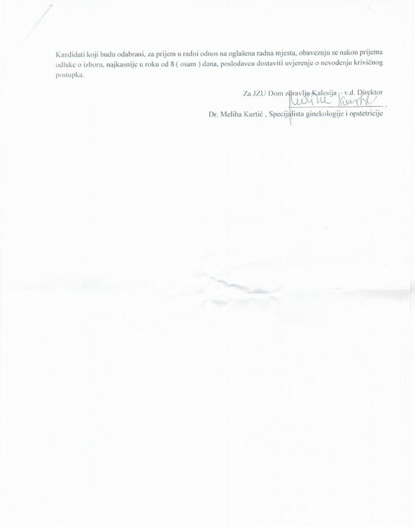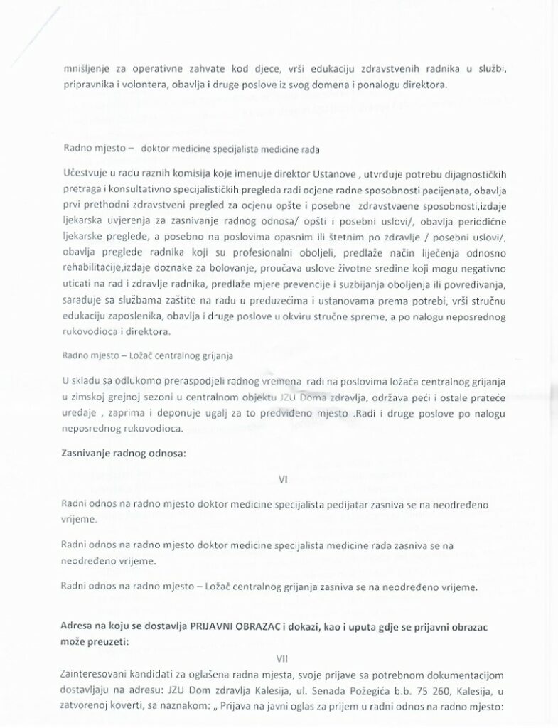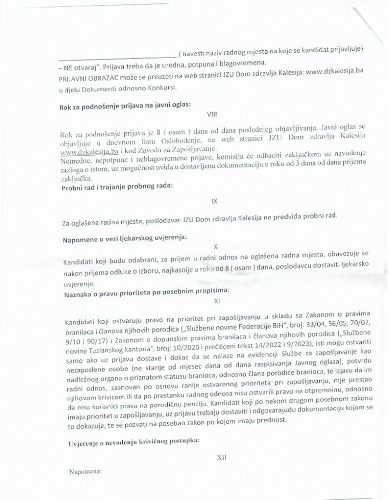 Rok za podnošenje prijava je 8 ( osam ) dana od dana poslednjeg objavljivanja. Javni oglas se objavljuje u dnevnom listu Oslobođenje, na web stranici JZU Dom zdravlja Kalesija www.dzkalesija.ba i kod Zavoda za zapošljavanje.