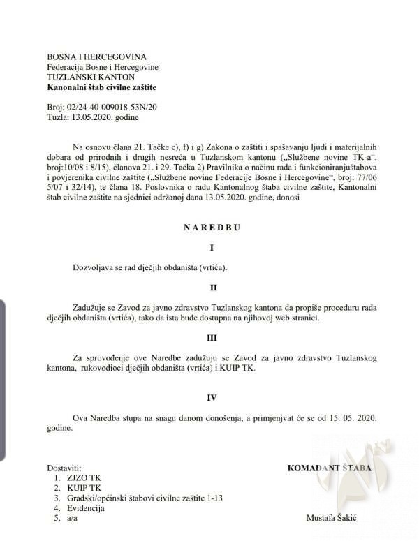 Kantonalni štab civilne zaštite Tuzla donio je Naredbu kojom se dozvoljava rad dječijih obdaništa (vrtića).