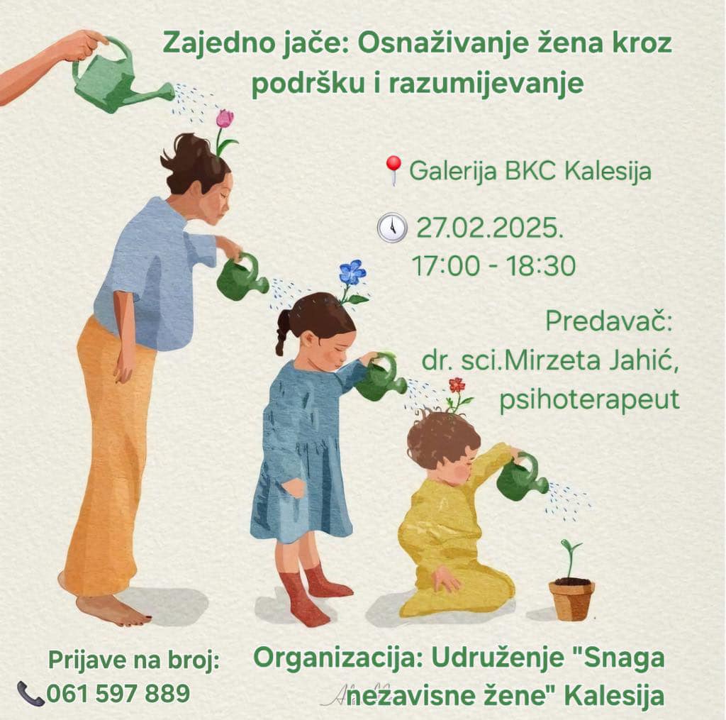 Dr.sci Mirzeta Jahić u četvrtak (27.2.2025.) održat će predavnje u okviru projekta Zajedno jače: Osnaživanje žena kroz podršku i razumijevanje. Predavanje će biti održano u Galeriji JU BKC “Alija Izetbegović” sa početkom u 17:00 sati.
