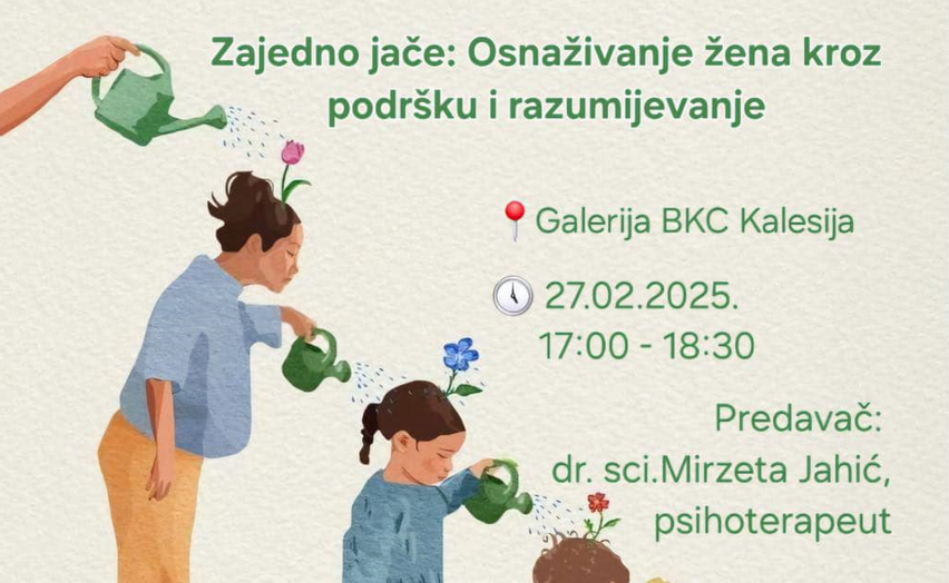 Dr.sci Mirzeta Jahić u četvrtak (27.2.2025.) održat će predavnje u okviru projekta Zajedno jače: Osnaživanje žena kroz podršku i razumijevanje. Predavanje će biti održano u Galeriji JU BKC “Alija Izetbegović” sa početkom u 17:00 sati.