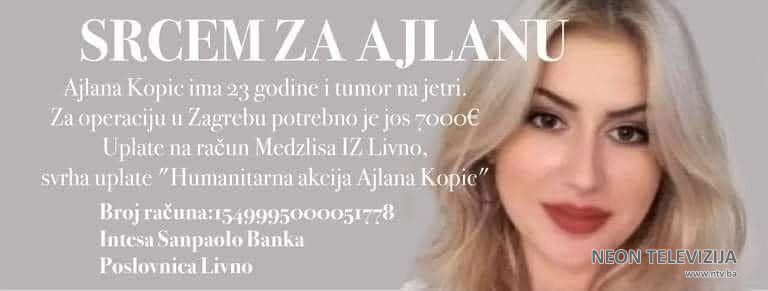 Dvadesetrogodišnjoj Ajlani Kopić nakon što je otkriven i otklonjen tumor na debelom crijevu i dalje je u borbi za sopstveni život. Ostale su tri tačke na jetri. Prošla je kemoterapije, međutim, nakon CT-a ustanovili su da se na jetri tumor proširio i hitno mora na operaciju. Za operaciju je potrebno još 7.000 eura, a ista će se obaviti u klinici u Zagrebu.
