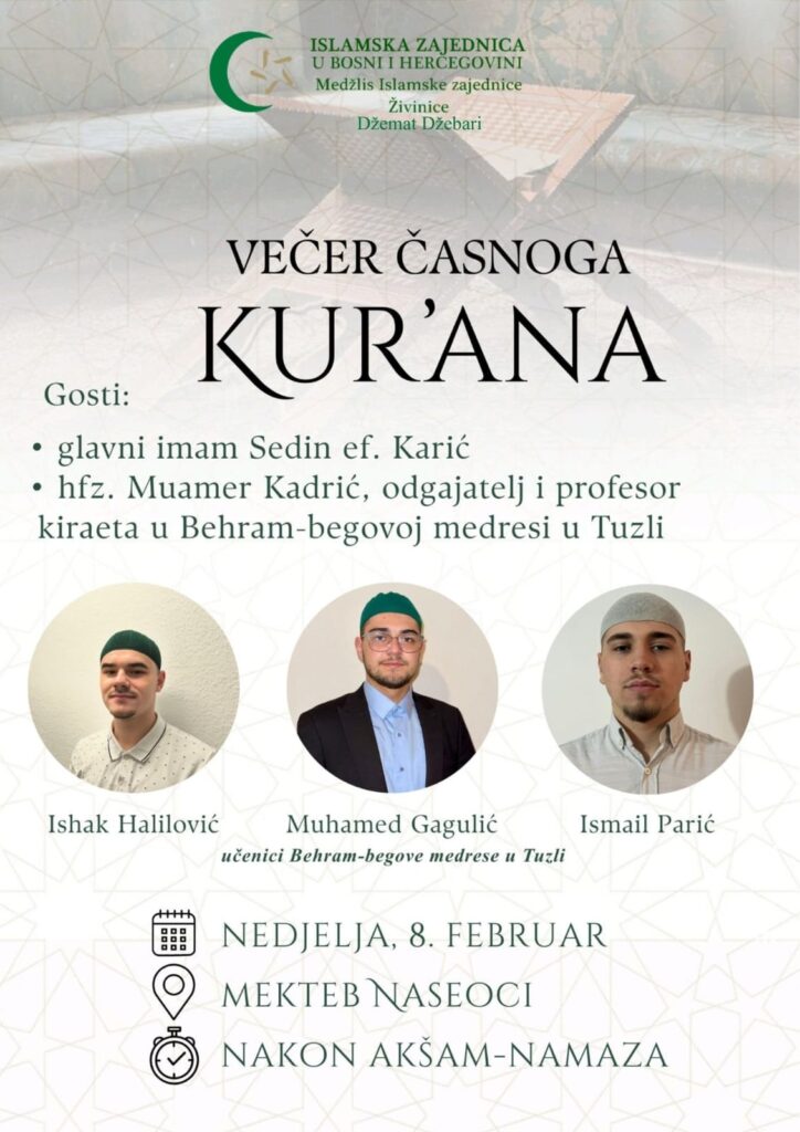 U mektebu Naseoci, koji djeluje u sklopu džemata Džebari, 8. februara 2026. godine biće upriličena manifestacija “Večer Časnog Kur'ana”.