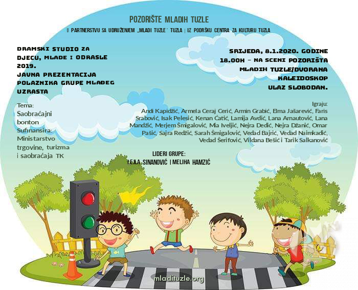 Danas u 18:00 sati u dvorani Kaleidoskop, Pozorište mladih Tuzle u saradnji sa Udruženjem „Mladi Tuzle“ i Centrom za kulturu Tuzla realizuje finalnu aktivnost projekta „Saobraćajni bonton“ kojeg sufinansira Ministarstvo trgovine, turizma i saobraćaja Tuzlanskog kantona po osnovu raspodjele namjenskih sredstava prikupljenih od naknade za obavljanje tehničkog pregleda vozila za 2019. godinu.