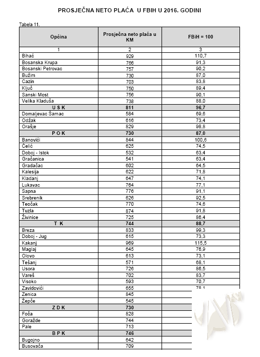 Najviša prosječna neto plaća u Federaciji u prošloj godini bila je u sarajevskoj općini Centar – 1.197 maraka, dok je najniža u Doboj-Istoku 532 KM. Ta općina je tako s trona s najnižom prosječnom plaćom skinula Gračanicu, u kojoj je prosječna plaća u 2015. godini bila svega 524 KM.