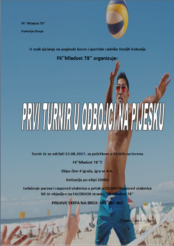 U znak sjećanja na poginule borce i sportske radnike Donjih Vukovija, FK “Mladost 78”organizuje prvi turnir u odbojci na pijesku. Turnir će se igrati u nedjelju (13.8.2017) sa početkom u 10:00 sati.
