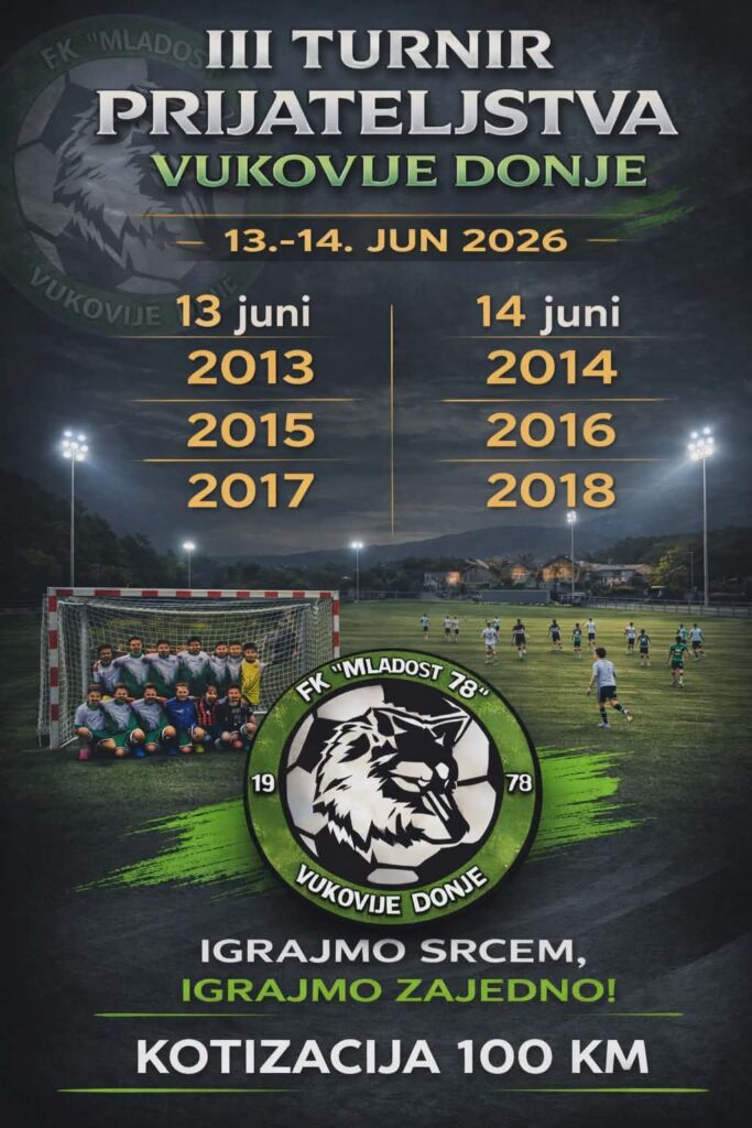 FK “Mladost 78” Vukovije Donje organizuje III Turnir prijateljstva, koji će biti održan 13. i 14. juna 2026. godine na stadionu u Vukovijama Donjim.