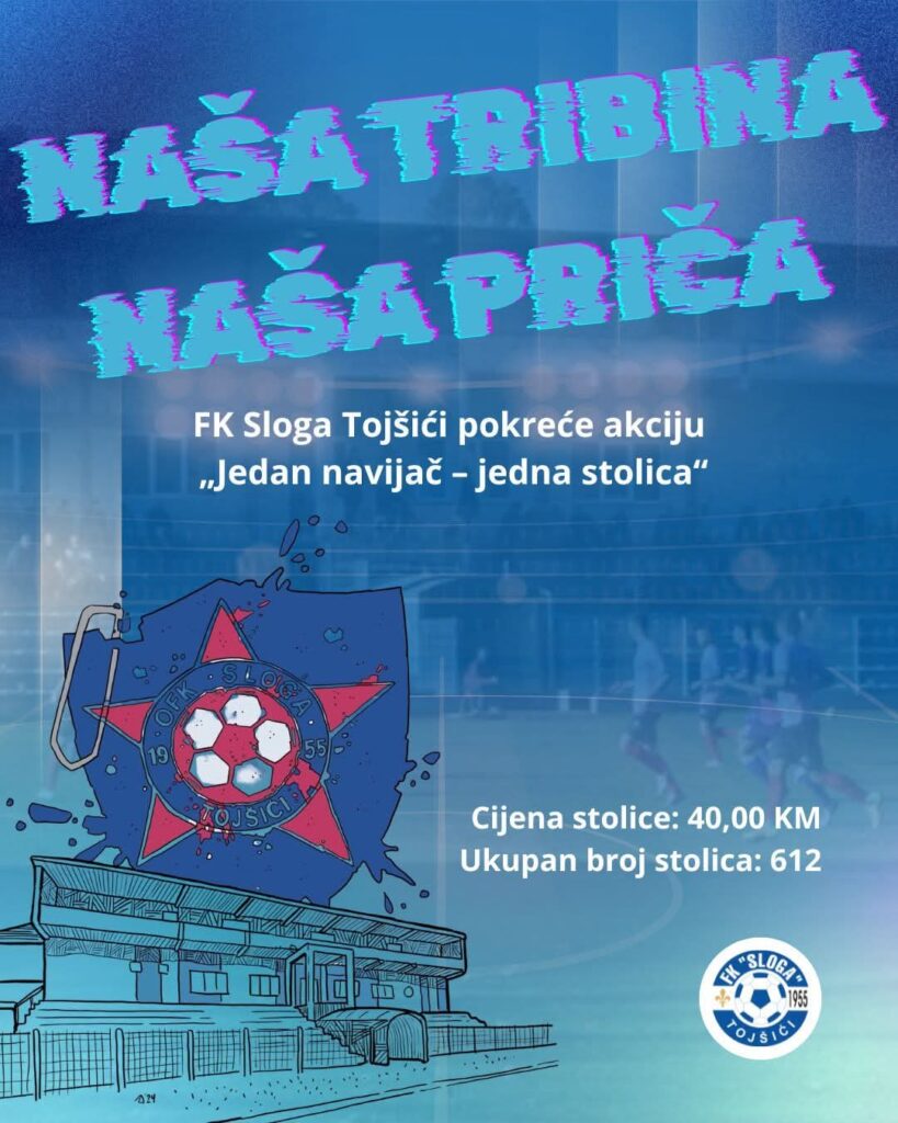 FK Sloga Tojšići pokreće akciju „Jedan navijač – jedna stolica“. Saopćenje kluba povodom pokretanja ove akcije prenosimo u nastavku.