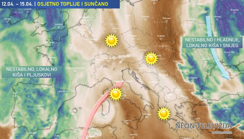 Od sutra pa do vikenda osjetno toplije uz sunčano vrijeme. Dnevne temperature od 15 do 22°C, u četvrtak (14.04.) i petak (15.04.) lokalno i do oko 25°C.