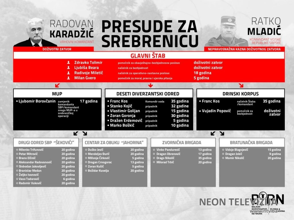Radovanu Karadžiću, prvom predsjedniku i vrhovnom komandantu Vojske Republike Srpske (VRS), Apelaciono vijeće je u martu 2019. godine izreklo kaznu doživotnog zatvora za genocid u Srebrenici, kao i zločine protiv čovječnosti i kršenje zakona i običaja ratovanja u drugim dijelovima BiH.