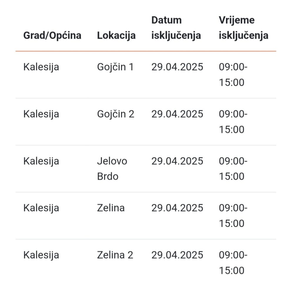Naselja Gojčin (I i II), Jelovo Brdo i Zelina (I i II) u općini Kalesija će u utorak (29. aprila) biti bez električne energije u periodu od 9 do 15 sati, najevljeno je iz EPBiH
