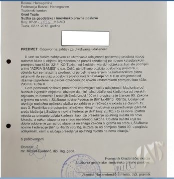 - Investitor ADRIA GAMES DOO ČELIĆ, obratio se Gradskoj službi za geodestske i imovinsko-pravne poslove zahtjevom za izdavanje Uvjerenja o udaljenosti. Ova služba je obavijestila investitora 2.11.2018. godine, dakle, petnaest dana prije nego što su počele reakcije u javnosti, da se predmetni objekat nalazi na manjoj udaljenosti od stotinu metara od vjerskog objekta, što znači da Uvjerenje koje im je potrebno za ishodovanje dozvole kod federalnog ministarstva, ne mogu dobiti.