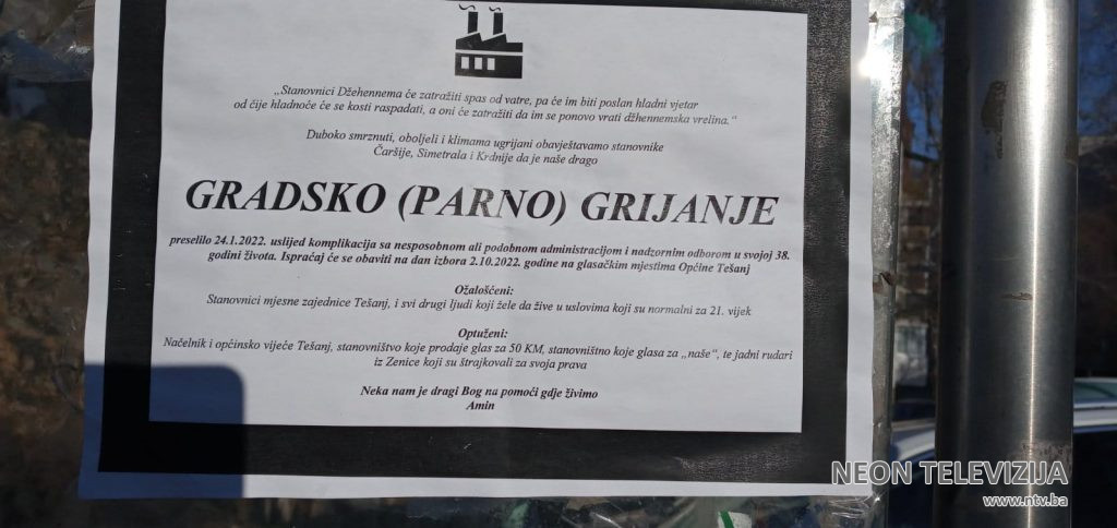 “Duboko smrznuti, oboljeli i klimama ugrijani, obavještavamo stanovnike Čaršije, Simetrala i Krndije da je naše gradsko parno grijanje preselilo 24.1.2022. uslijed komplikacija sa nesposobnom, ali podobnom administracijom i nadzornim odborom u svojoj 38. godini života. Ispraćaj će se obaviti na dan izbora, 2.10.2022. na glasačkim mjestima općine Tešanj. Ožalošćeni: stanovnici mjesne zajednice Tešanj i svi drugi ljudi koji žele da žive u uslovima koji su normalni za XXI vijek. Optuženi: načelnik i općinsko vijeće Tešanj, stanovništvo koje prodaje gas za 50 KM, stanovništvo koje glasa za ‘naše’, te jadni rudari iz Zenice koji su štrajkovali za svoja prava. Nek nam je dragi bog na pomoći, gdje god živimo. Amin!”, poručili su građani.