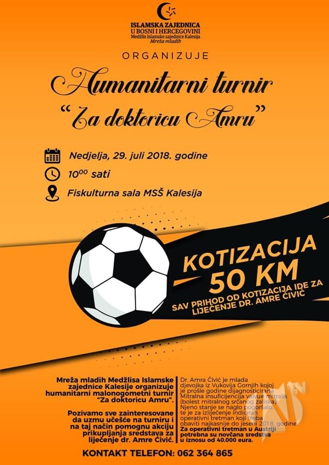 Kako bi se što prije prikupila novčana sredstva za liječenje mlade doktorice Amre Ćivić, u humanitarnu akciju uključili su se i mladi MIZ Kalesija. Mreža mladih MIZ Kalesija u nedjelju, 29. jula 2018. godine organizuje humanitarni turnir pod nazivom “Za doktoricu Amru” Sav prihod koji se skupi od kotizacije ide za liječenje mlade doktorice Amre Ćivić.Kotizacija po ekipi iznosi 50 KM.