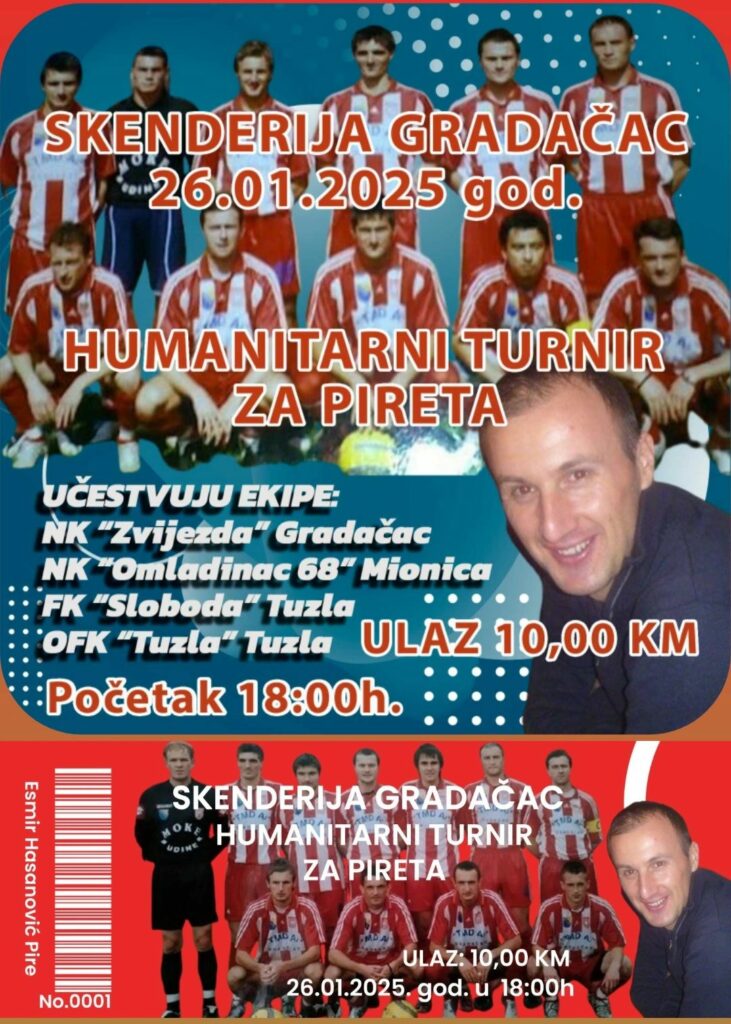 Kako bi pomogli svom drugu, Esmirovi prijatelji i bivši saigrači organizovali su fudbalsku utakmicu humanitarnog karaktera koja je prošlog petka odigrana u dvorani “Mejdan”, a subotu (26. januar) će u Gradačcu biti organizovan “Humanitarni turnir za Pireta”. Riječ je o turniru koji organizuju Esmirovi nekadašnji saigrači iz NK Zvijezda Gradačac a koji će se održati u gradačačkoj Skenderiji u subotu sa početkom u 18 sati.