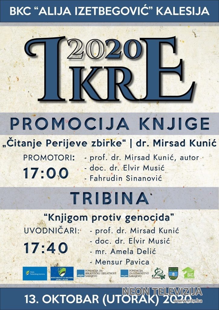 U okviru Kulturne manifestacije „Ikre 2020“, kojom JU BKC “Alija Izetbegović” Kalesija i BZK “Preporod” Kalesija obilježavaju Mjesec knjige,  sutra, u utorak, 13. oktobra, sa početkom u 17,00 sati, održat će se promocija knjige „Čitanje Perijeve zbirke“,  prof. doktora Mirsada Kunića.