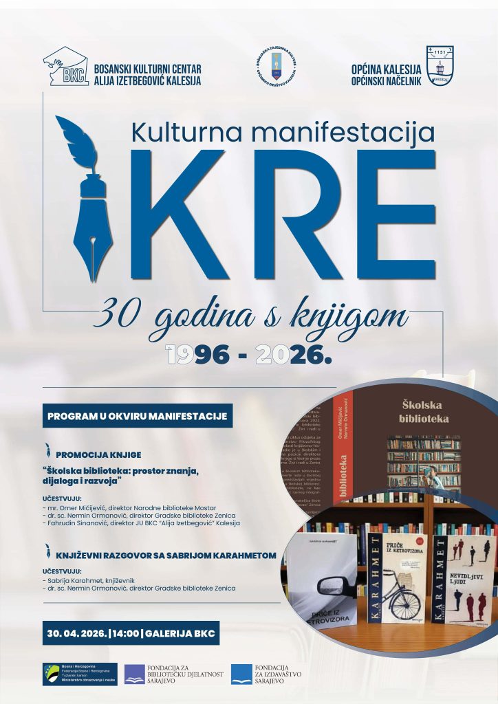 U okviru manifestacije “IKRE 2026” u četvrtak 30. aprila 2026. godine sa početkom u 14.00 sati, biće upriličena dva događaja u galeriji BKC-a “Alija Izetbegović” Kalesija, promocija i književni razgovor.