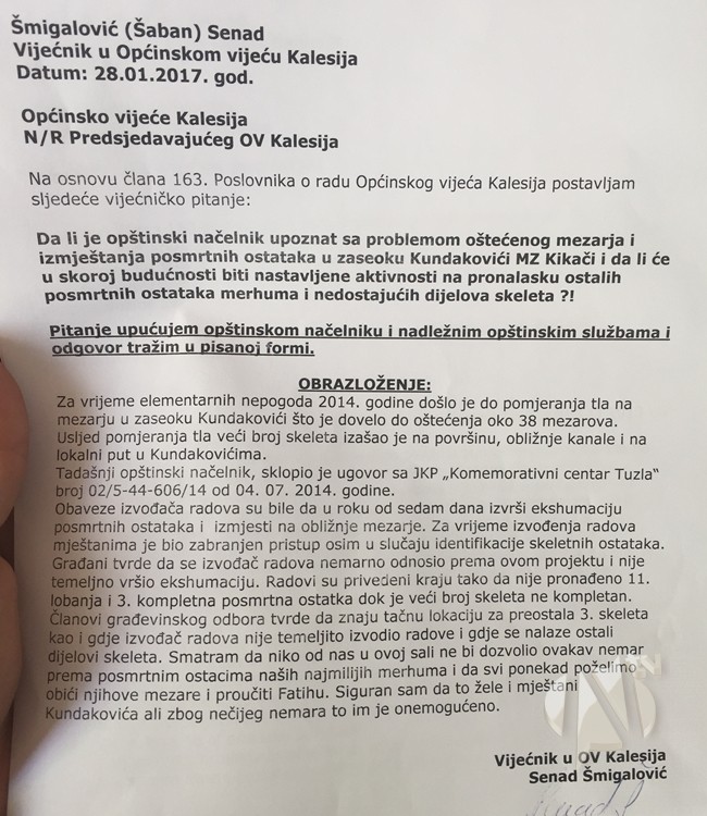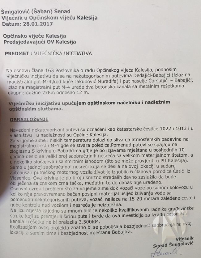 10:22 – Senad Šmigalović (SDP) – Tražim da se rješi problem “krivine” u Babajićima gdje do sada zabilježen veliki broj nesreća, a također tražim informaciju da li je načelnik upoznat sa mezarjem u Kundakovićima.