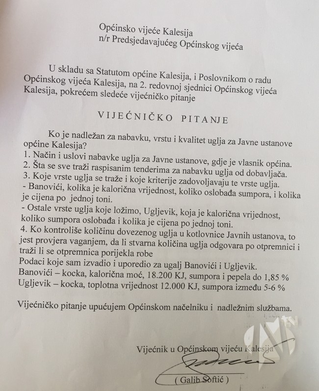 10:15 – Galib Softić (SDP) – Imam jedno pitanje i inicijativu. Šta se to loži u kotlovnicama u Kalesiji, šta se traži tenderima za nabavku uglja, koliko sumpora oslobođa itd. Vidite da u ovoj zgradi gdje se loži (na ulazu u Kalesiji) kakav je dim i koliko zagađuje. Zato bi zamilio sve da vode računa gdje nabavljaju ugalj u interesu građana i da što manje se zagađuje okolina. Ovo pitanje upućujem načelniku i službama. Inicijativom tražim da se uvrsti u dnevni red vodosnabdijevanje, kvaliteta vode i cijena.