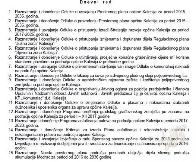13:23 – Razmatranje i donošenje Programa uređenja gradskog građevinskog zemljišta po zonama na području općine Kalesija za period I – XII 2017.godine.