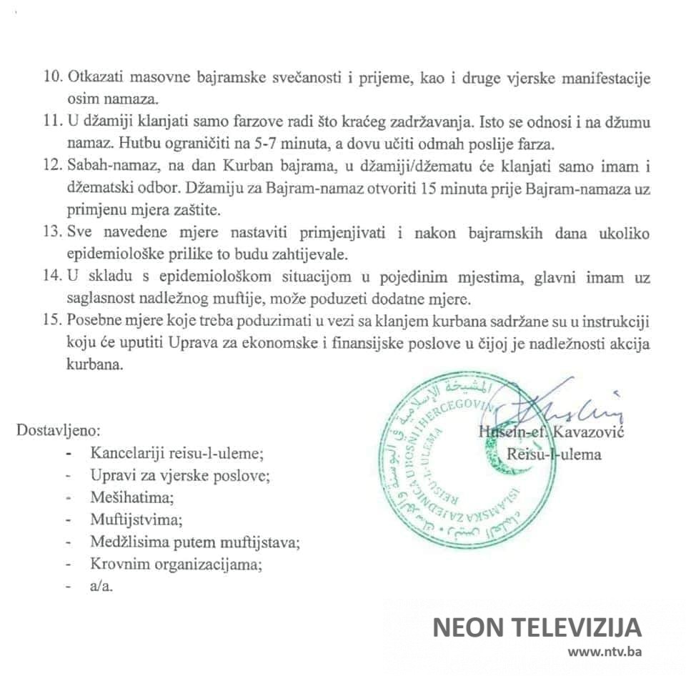 Zbog pogoršane epidemiološke situacije u BiH, Reisu-l-ulema Husein ef. Kavazović je potpisao novu Instrukciju kojom se određuju novi uslovi obavljanja namaza u džamijama i obavljanje predstojećeg bajram namaza.