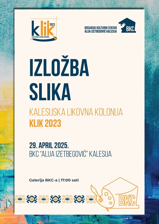 U BKC “Alija Izetbegović” Kalesija će u utorak 29. 04. 2025. godine, u 17:00 sati, biti otvorena izložba slika sa Kalesijske likovne kolonije KLIK 2023.