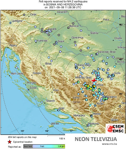 Zemljotres jačine 4,2 stepena prema Richterovoj skali registrovao je Evropski mediteranski seizmološki centar, a epicentar je zabilježen na području Zenice.