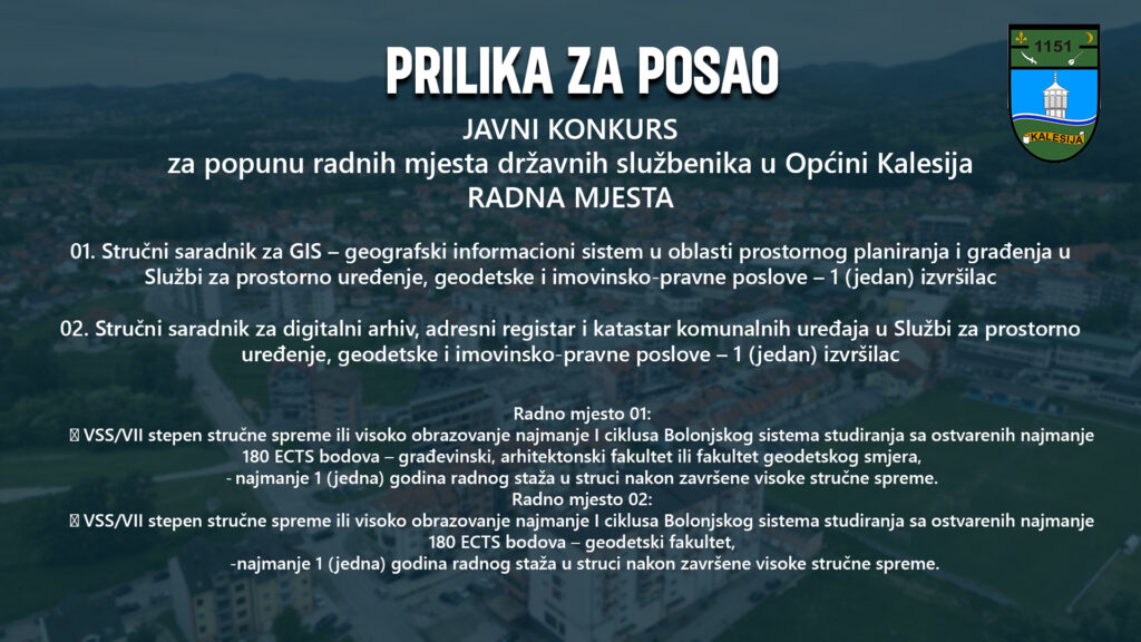 1. Stručni saradnik za GIS – geografski informacioni sistem u oblasti prostornog planiranja i građenja u Službi za prostorno uređenje, geodetske i imovinsko-pravne poslove