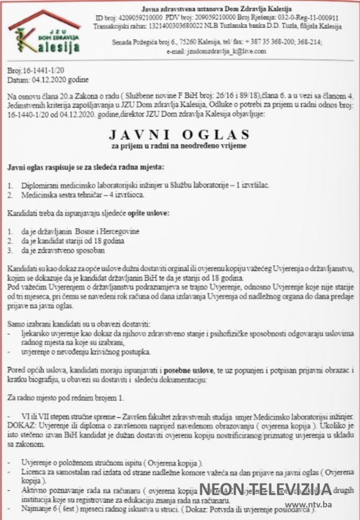 JZU Dom zdravlja Kalesija je 04.12.2020. raspisao Javni oglas za prijem u radni odnos, ukupno 5 osoba.