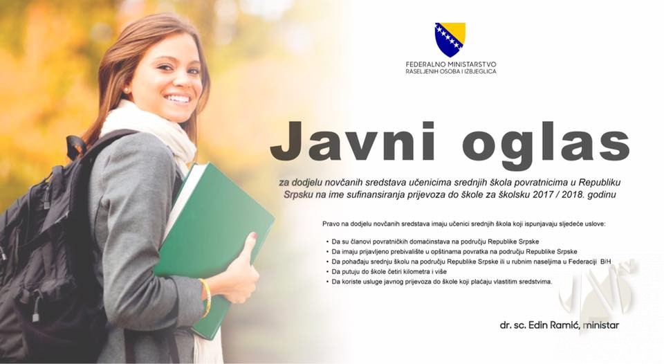 Federalno ministarstvo raseljenih osoba  i izbjeglica raspisalo je Javni oglas za za sufinansiranje prijevoza učenicima srednjih škola u povratničkim zajednicama.