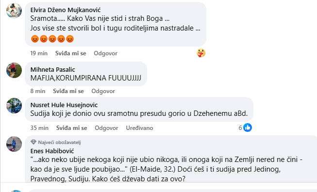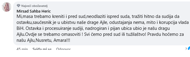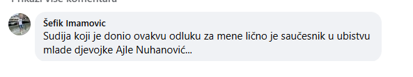 Sudija koji je donio ovakvu odluku za mene je saučesnik u ubistvu mlade djevojke Ajle Nuhanović… Žalosno da žalosnije ne može biti..“, napisao Šefik Imamović a koji obavlja i funkciju vijećnika u OV Kalesija.