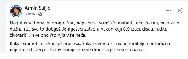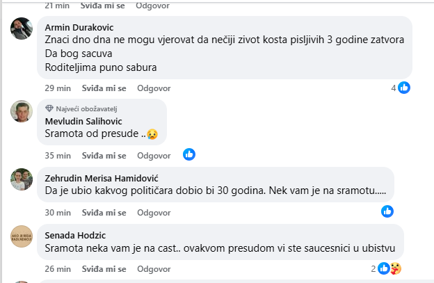 “Pitam se kakva se poruka šalje vozačima ovakvim presudama? Da je okej voziti pod dejstvom alkohola i droge i pritom ubiti drugu osobu jer svakako će kazna za to biti mizerna. Pred Ajlom je bila cijela budućnost, a sistem kaže da taj mladi život vrijedi samo tri godine zatvora. Tri godine za smrt mlade djevojke je praktično poziv na neodgovornost, a dok god su kazne ovakve, naši putevi će biti mjesta tragedije dok pravda ostaje samo mrtvo slovo na papiru. Pretužno i poražavajuće” ovo je jedan od komentara na vijest da je Vejsil Halilović osuđen na tri godine zatvora a zbog saobraćajne nesreće u kojoj je smrtno stradala devetnaestogodišnja Ajla Nuhanović iz Vukovija.