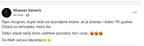 Pijan, drogiran, duplo brže od dozvoljene brzine…ali je priznao i dobio TRI godine. Država za nečovjeka, nema šta. Toliko vrijedi nečiji život, uništene porodice, bol i suze…😡😡😡 Da Allah sačuva iskušenja” napisao je Muamer Kamerić, imam u džematu Miljanovci.