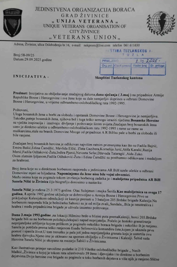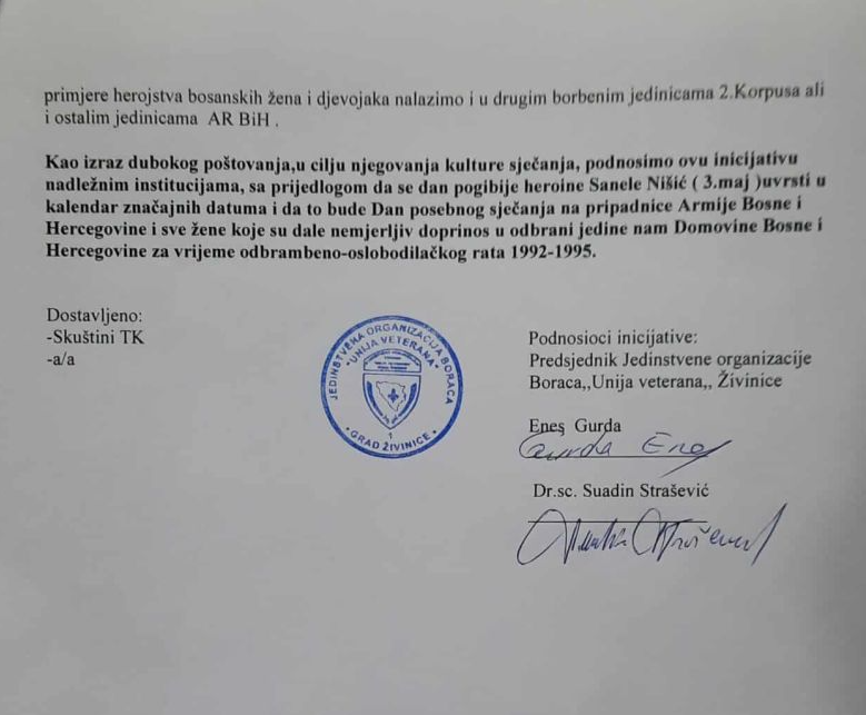 – Kao izraz dubokog poštovanja, u cilju njegovanja kulture sjećanja, podnosimo ovu Inicijativu nadležnim institucijama, sa prijedlogom da se dan pogibije heroine Sanele Nišić (3. maj) uvrsti u kalendar značajnih datuma i da to bude Dan posebnog sjećanja na pripadnice Armije Republike Bosne i Hercegovine, i sve žene koje su dale nemjerljiv doprinos u odbrani Domovine Bosne i Hercegovine za vrijeme odbrambeno-oslobodilačkog rata 1992-1995.
