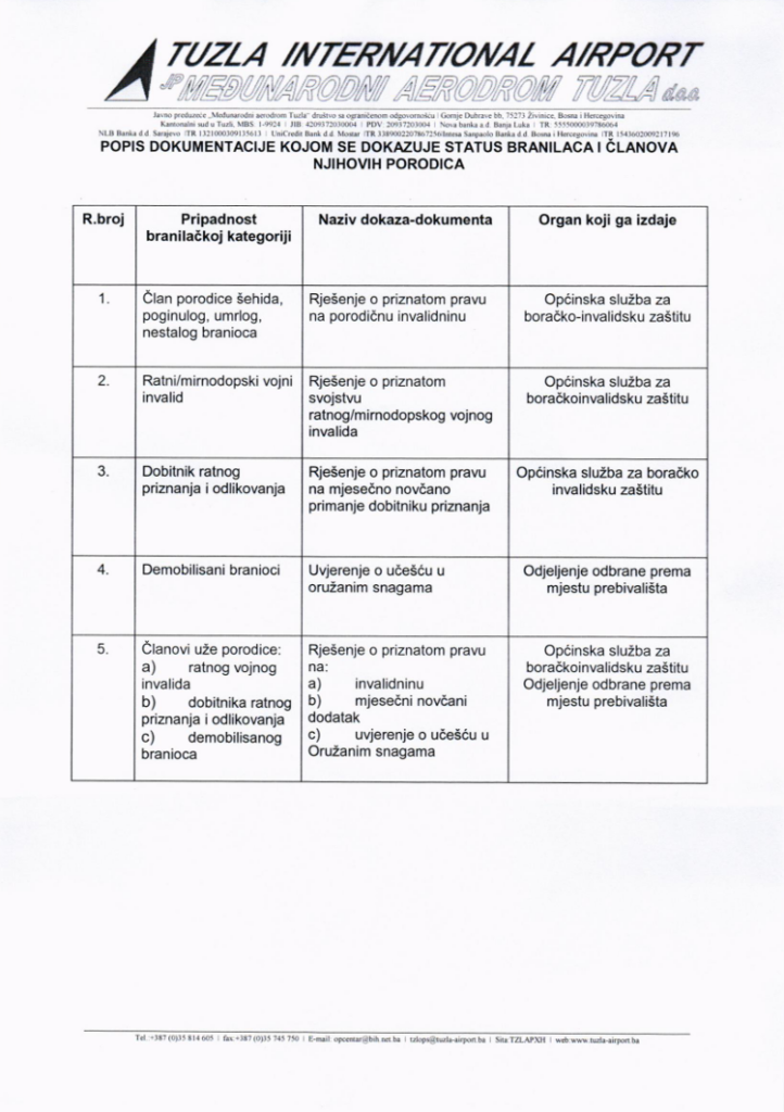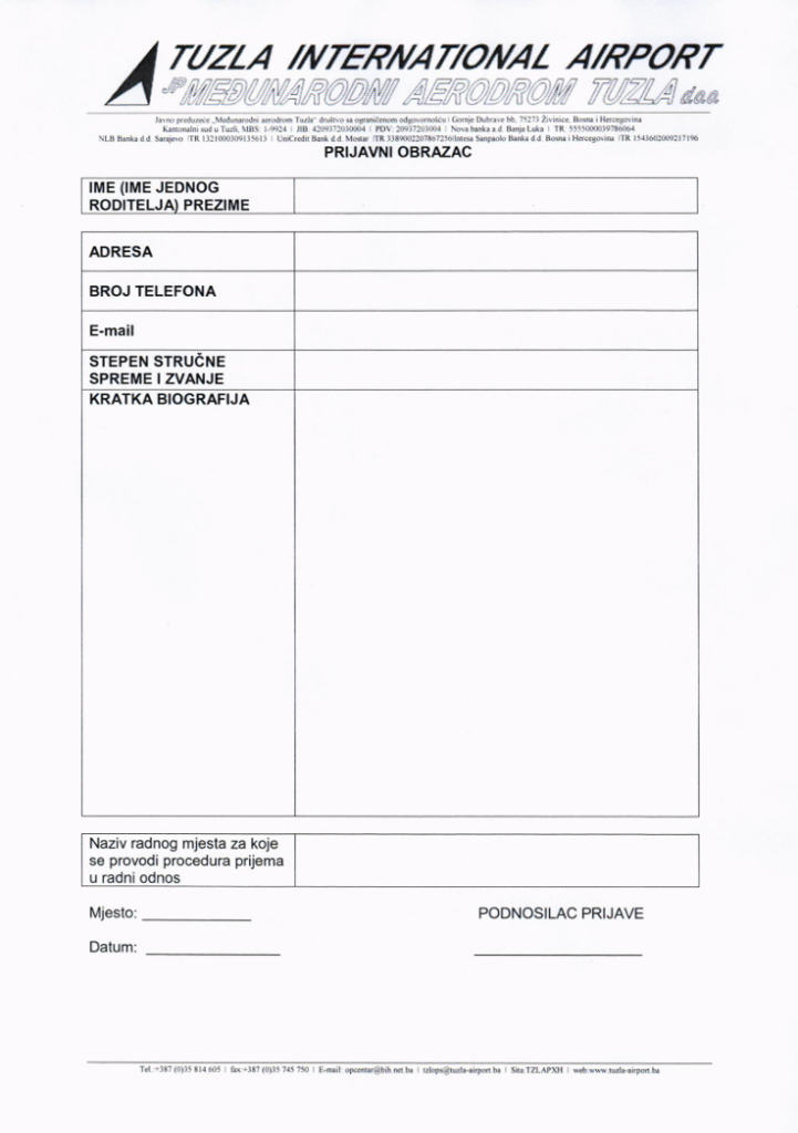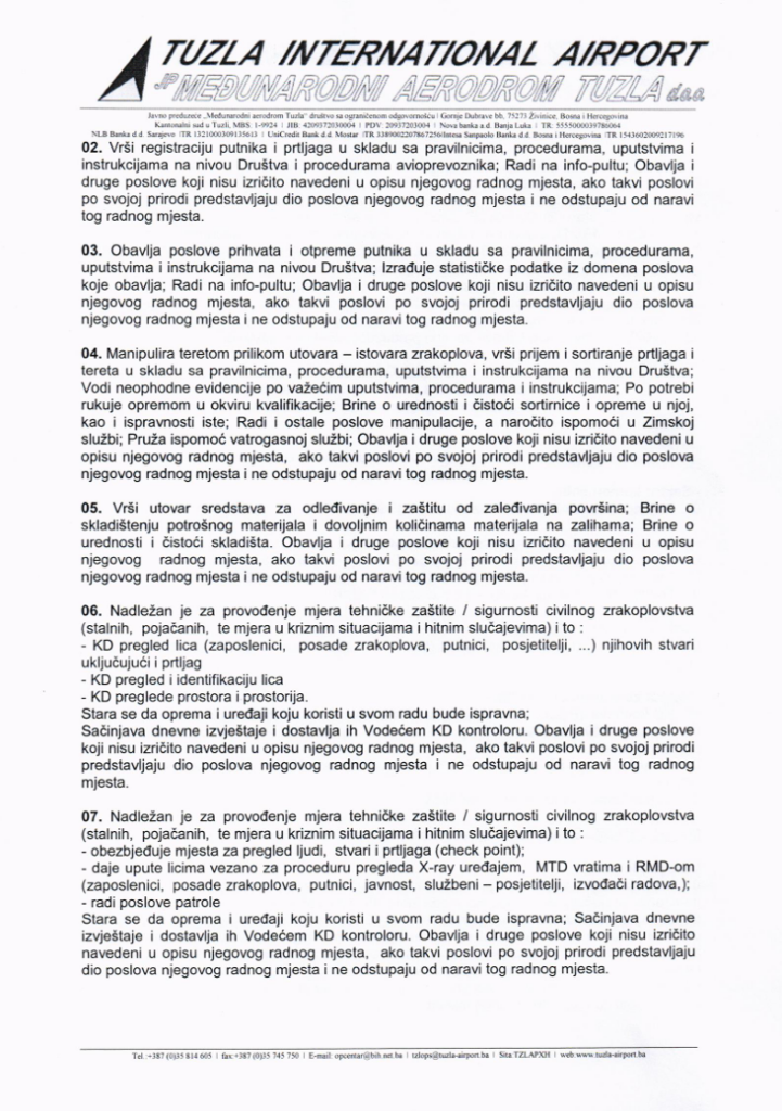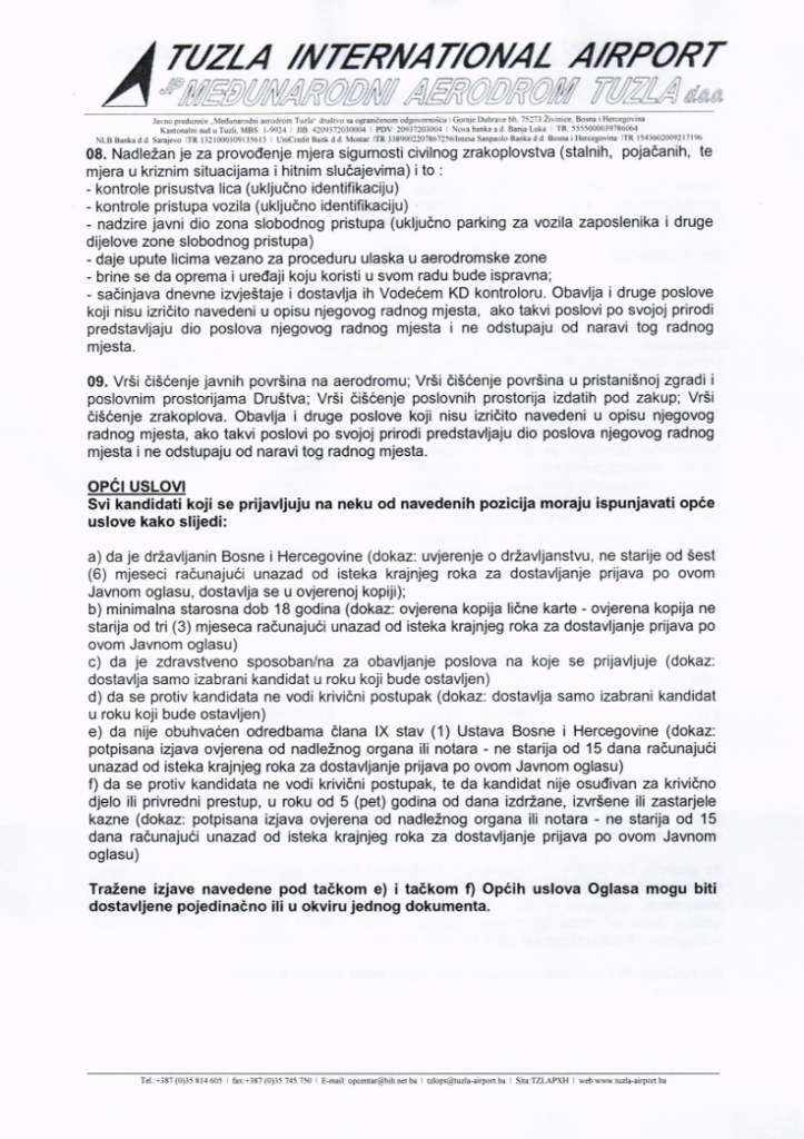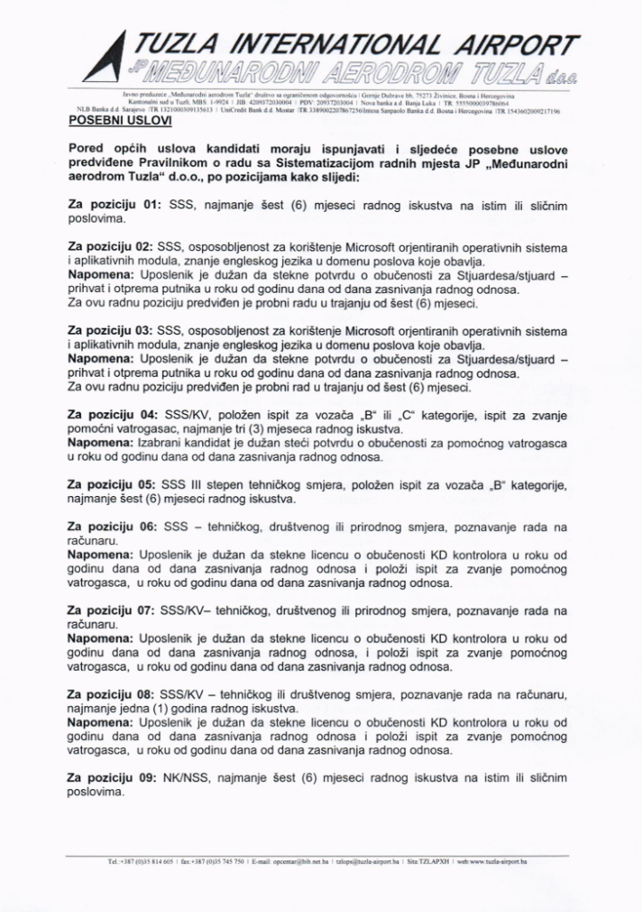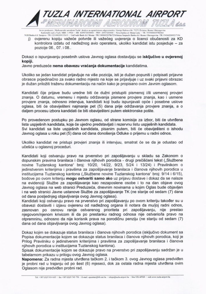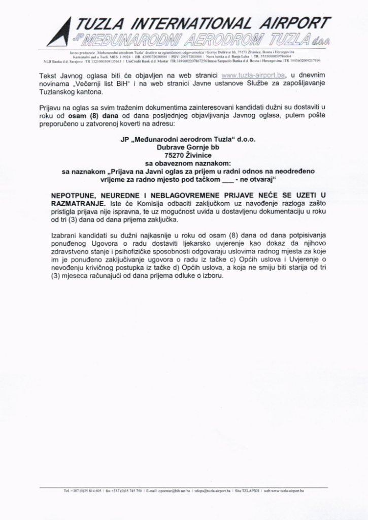 JP Medunarodni aerodrom Tuzla d.o.o. raspisuje javni oglas za prijem radnika na neodređeno vrijeme na pozicije: