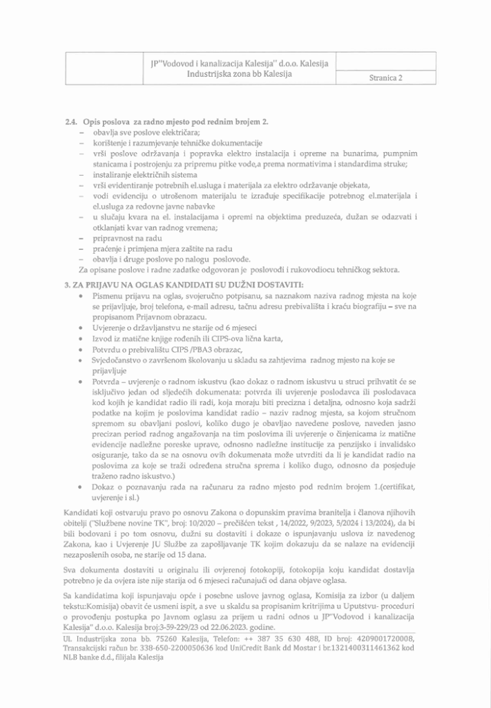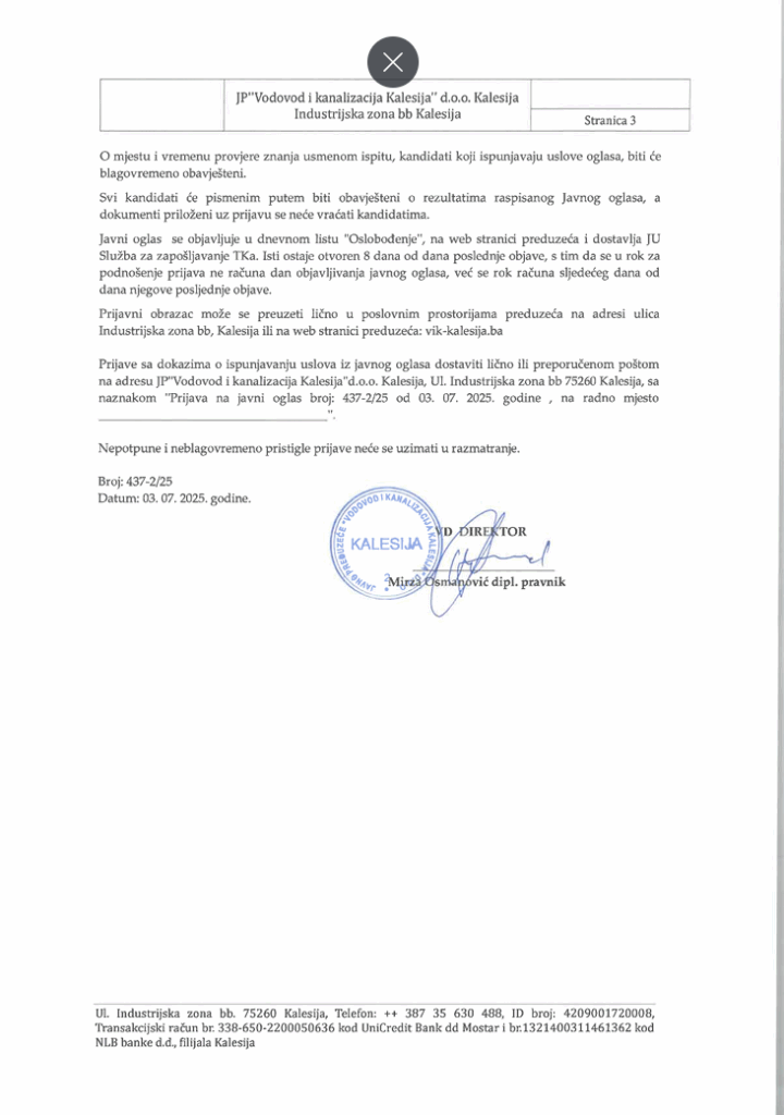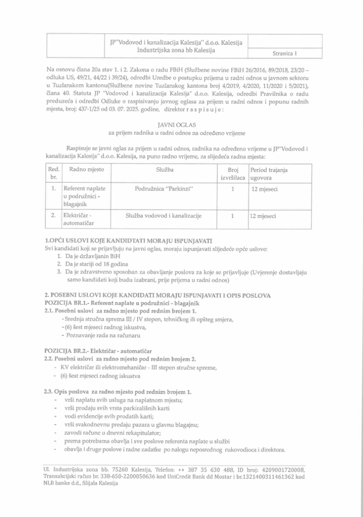 JP Vodovod i kanalizacija doo Kalesija raspisuje javni oglas za prijem radnika u radni odnos na određeno vrijeme na sljedeće pozicije: